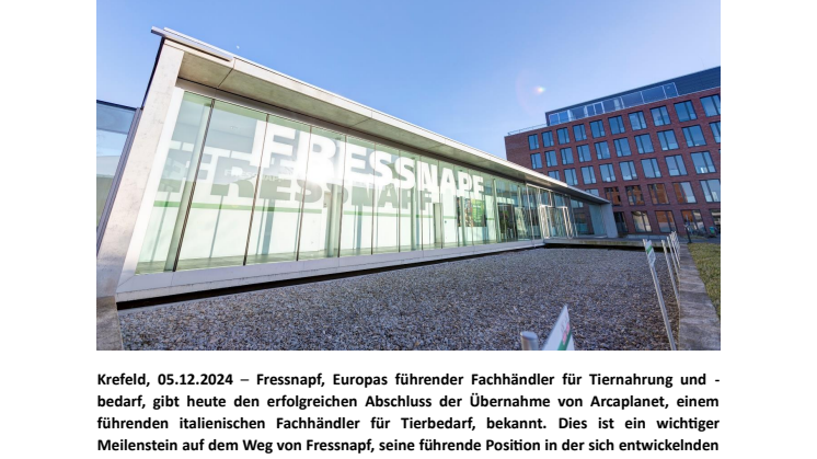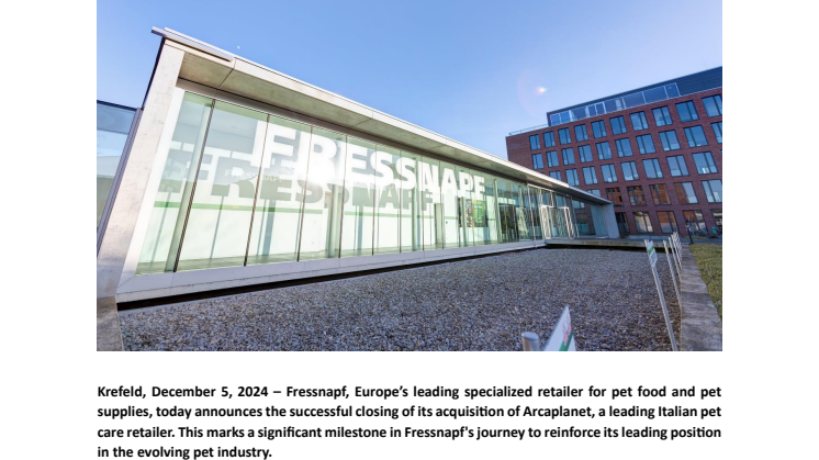 Krefeld, December 5, 2024 – Fressnapf, Europe’s leading specialized retailer for pet food and pet supplies, today announces the successful closing of its acquisition of Arcaplanet, a leading Italian pet care retailer. This marks a significant milestone in Fressnapf's journey to reinforce its leading position in the evolving pet industry.