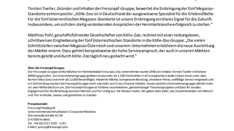 Torsten Toeller, Gründer und Inhaber der Fressnapf-Gruppe, bewertet die Einbringung der fünf Megazoo-Standorte extrem positiv: „Kölle-Zoo ist in Deutschland der ausgewiesene Spezialist für die Erlebnisfläche. Für die fünf österreichischen Megazoo-Standorte ist unsere Einbringung ein klares Signal für die Zukunft. Insbesondere, um sich den stetig verändernden Ansprüchen der Heimtierbranche erfolgreich zu stellen.“